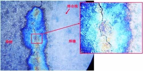 接管與筒體接頭焊后進(jìn)行的MT、UT和RT檢測(cè)未發(fā)現(xiàn)缺陷,而熱處理MT檢測(cè)發(fā)現(xiàn)缺陷,在接管與筒體焊縫內(nèi)壁熔合線區(qū)域有多處線性顯示,長(zhǎng)度均在20~30mm。對(duì)其中某個(gè)MT顯示區(qū)域進(jìn)行PT檢測(cè),檢查發(fā)現(xiàn)線狀顯示,PT與MT顯示位置基本重合。對(duì)PT顯示區(qū)域進(jìn)行現(xiàn)場(chǎng)金相觀察,在拋光腐蝕后可肉眼觀察到位于焊縫熔合線處有細(xì)長(zhǎng)裂紋存在,長(zhǎng)度約20mm。對(duì)裂紋進(jìn)行金相觀察,通過顯微鏡發(fā)現(xiàn)裂紋位于焊縫熔合線上,裂紋細(xì)長(zhǎng),如圖1所示。